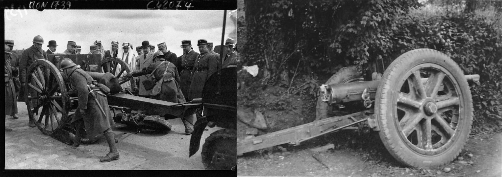 1. ábra: A francia Canone de 75 mle. 1897 mobilizálására több megoldás is született – baloldalt a Citroёn által tervezett pótkocsi felhelyezése, jobbra a löveg modernizált változata, a Canone de 75 mle. 1897 mod. 1938 látható